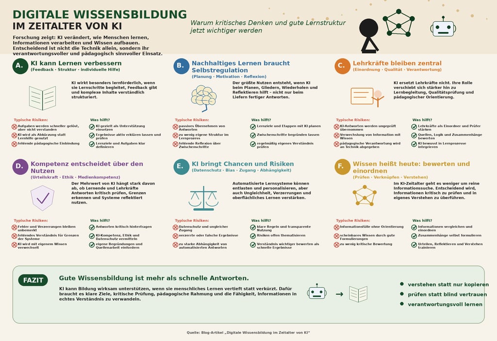 Ein zentrales Muster der aktuellen Forschung ist, dass KI besonders wirksam wird, wenn sie Lernende bei Planung, Struktur, Motivation und Reflexion unterstützt. Das betrifft zum Beispiel die Gliederung komplexer Themen, die Begleitung von Lernzielen oder die Rückmeldung zu Zwischenschritten. KI scheint also nicht nur als „Antwortmaschine“ relevant zu sein, sondern vor allem als Werkzeug, das Menschen hilft, ihr Lernen bewusster zu steuern. Gerade darin liegt ein wichtiger Beitrag zur digitalen Wissensbildung.