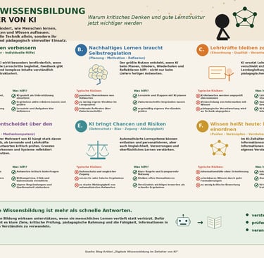 Früher bestand eine zentrale Herausforderung des Lernens oft darin, überhaupt an Informationen zu gelangen. Heute ist Wissen scheinbar jederzeit abrufbar. Durch KI wird diese Entwicklung noch einmal verstärkt. Dadurch gewinnt eine andere Fähigkeit an Bedeutung: die Fähigkeit, Informationen kritisch zu prüfen, sinnvoll zu verknüpfen und in eigenes Verstehen zu überführen. Wissensbildung im KI-Zeitalter bedeutet deshalb immer weniger reines Recherchieren und immer mehr Urteilen, Reflektieren und Verstehen.
