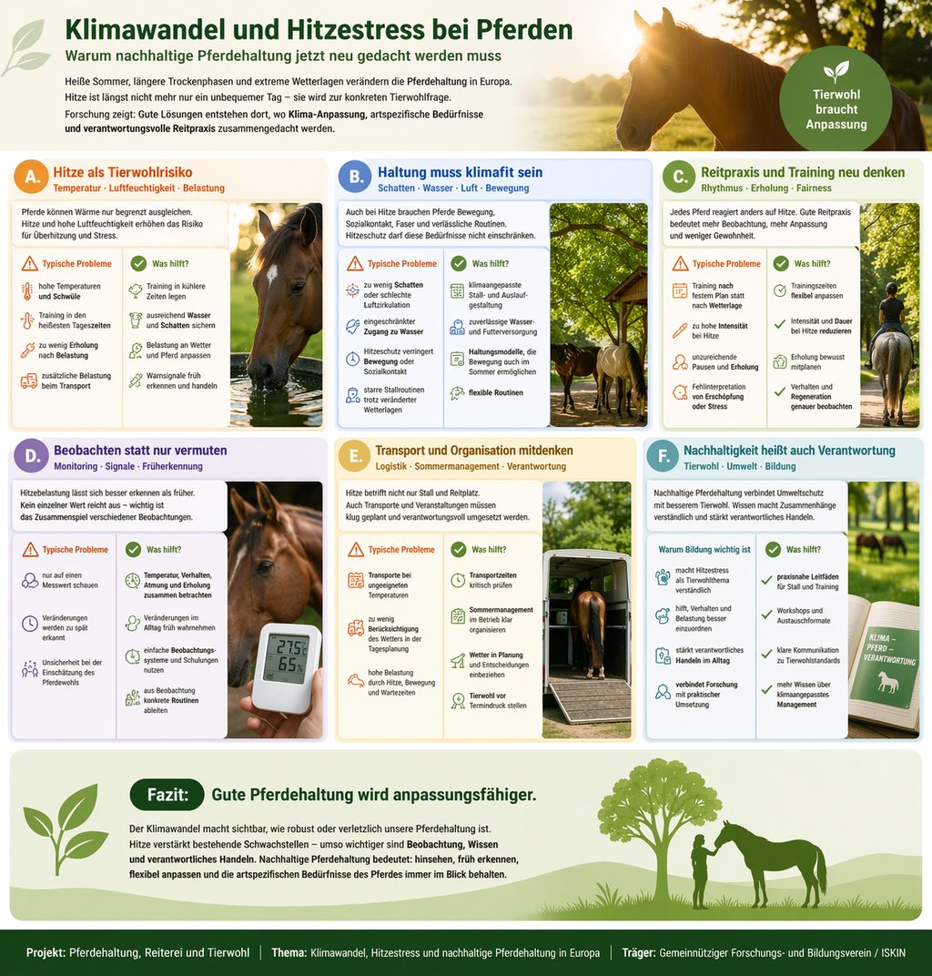 Dabei geht es nicht nur darum, Pferde „vor Sonne zu schützen“. Entscheidend ist, wie Haltung, Training, Versorgung und Mensch-Pferd-Umgang insgesamt gestaltet werden. Forschung und Praxis zeigen: Gute Lösungen entstehen dort, wo Klima-Anpassung, artspezifische Bedürfnisse und verantwortungsvolle Reitpraxis zusammengedacht werden.