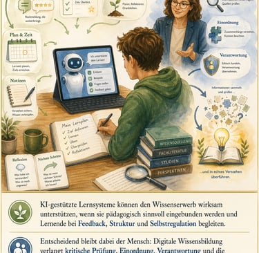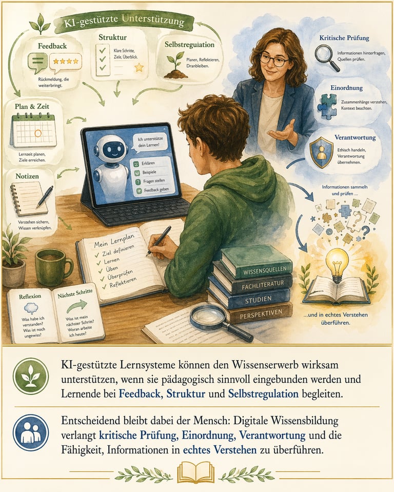 KI-gestützte Lernsysteme können den Wissenserwerb wirksam unterstützen, wenn sie pädagogisch sinnvoll eingebunden werden und Lernende bei Feedback, Struktur und Selbstregulation begleiten.